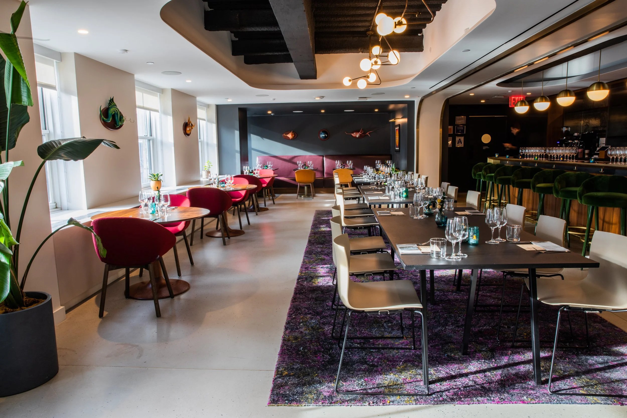 Perched high on the 32nd floor of 75 Rockefeller Center, Convene’s Club 75 is a members-only club that overlooks the beautiful Manhattan skyline and features sleek, art deco-inspired interiors throughout its softly-lit dining room. Features include a private restaurant space, bar, and conference room. Notably, the space spans throughout the entire floor, making it ideal for our professional neighbors to host everything from small, show-stopping dinners to 100+ person receptions alike.